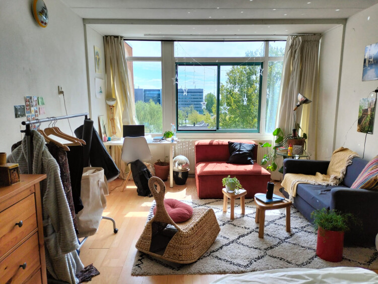 We wonen op koprolafstand van de Jumbo, de tram naar het strand stopt voor de deur en het is 10 minuten fietsen naar de TU en het centrum. De kamer is groot, 22 m2, en je deelt de badkamer en keuken met maar 1 iemand, voor ongeveer €380 per maand!